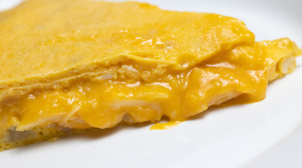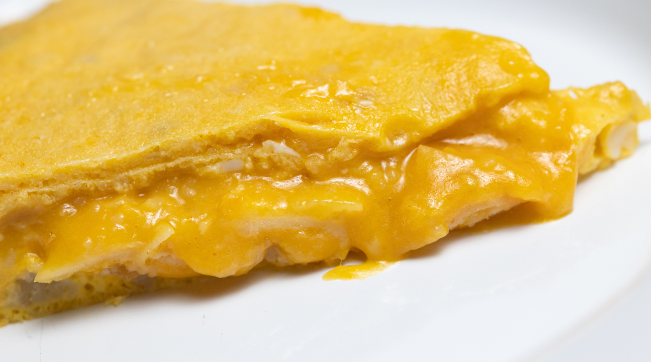 Jugosa y contundente tortilla con chorizo de porco celta y una crujiente capa de queso de Arzúa-Ulloa.