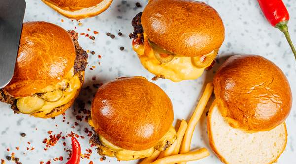 Smash burger de ternera (175 g.), queso cheddar, cebolla pochada, bacon crujiente y huevo a la plancha en un pan brioche exquisito