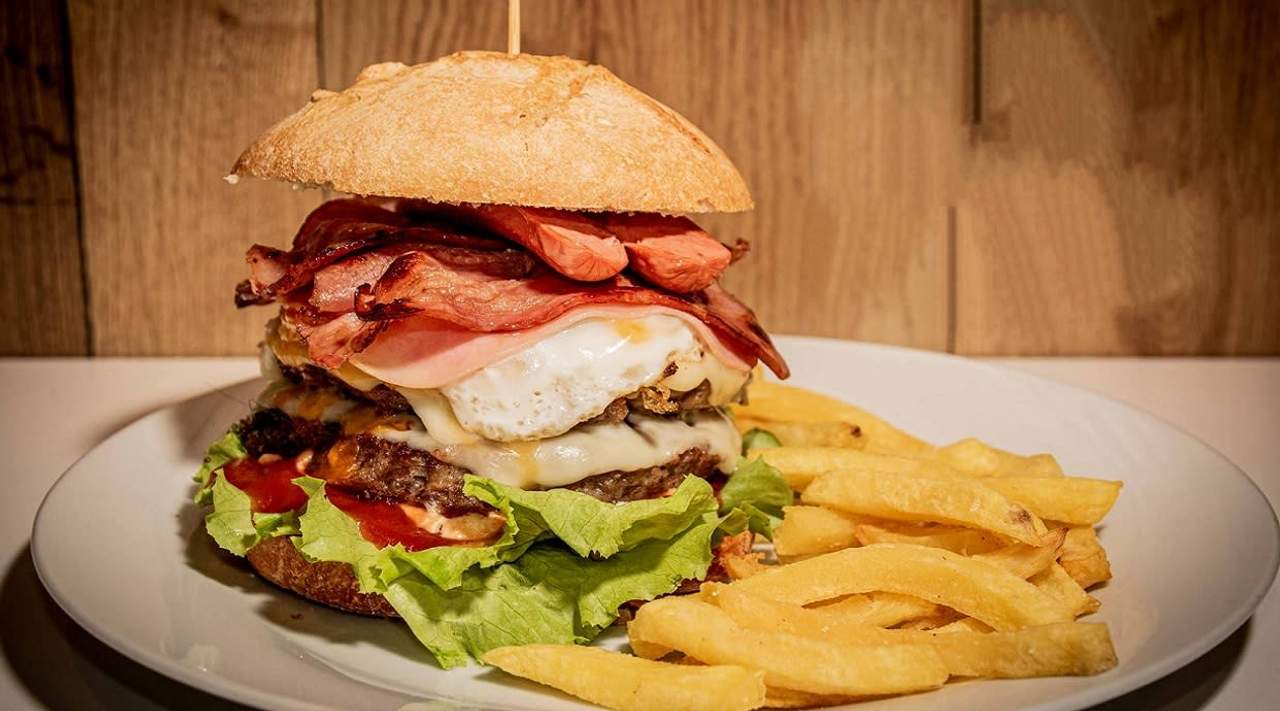 pan recién horneado , 200 gramos de carne 100% vacuno , lechuga , tomate ,carne de pollo o ternera , queso , huevo y jamón york