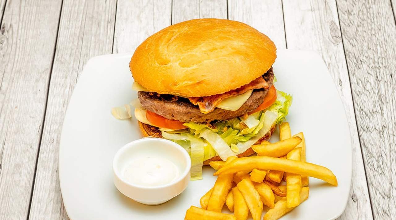 Hamburguesa de ternera (200 g.), bacon y patatas fritas