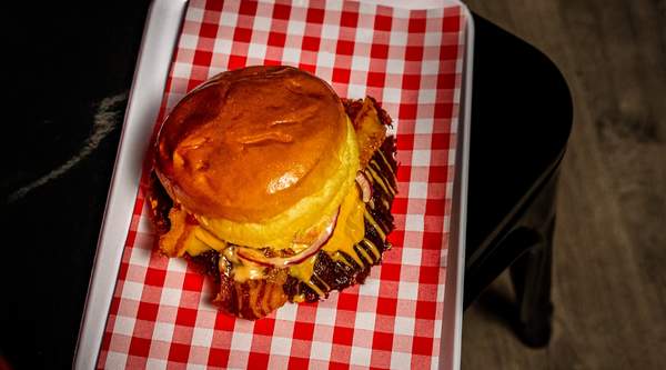 Carne dry age, mermelada de bacon, cebolla grillada, salsa bacon, salsa BBQ, salsa Emmy, salsa cheddar y pan de elaboración propia