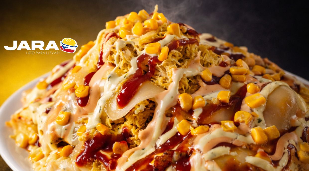Patatas Fritas, Jugoso pollo, Salchicha Frankfurt, Capa de queso fundido, Salsa Mayo-Guacamole, Salsa Rosa, Salsa de Piña, Platano Maduro y Huevos de codorniz, UNA BOMBA DE SABOR!
