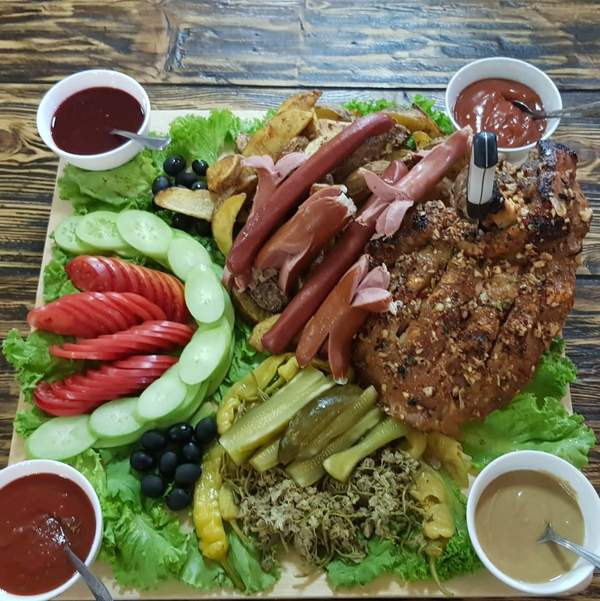 ქათმის ხორცი, ღორის ხორცი, ტაბაკა, მჟავის ასორტი, ტყემალი, კიტრი-პომიდვრის სალათი