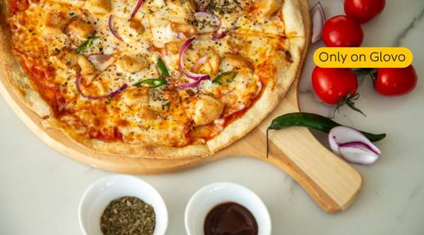 პომიდვრისა და ბარბექიუს სოუსი, მოცარელა, ქათამი, ხახვი, მწვანე წიწაკა