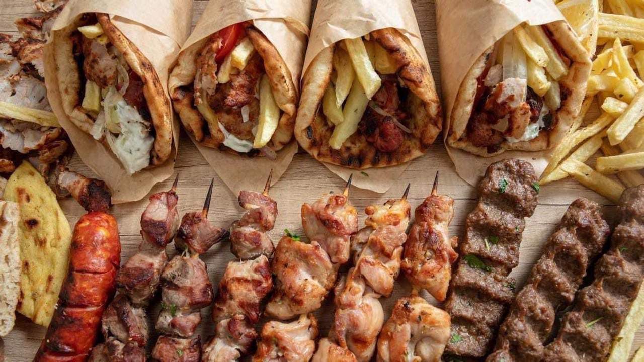 ღორის ხორცი,პიტა,პომიდორი,ხახვი,ძაძიკი,კარტოფილი ფრი