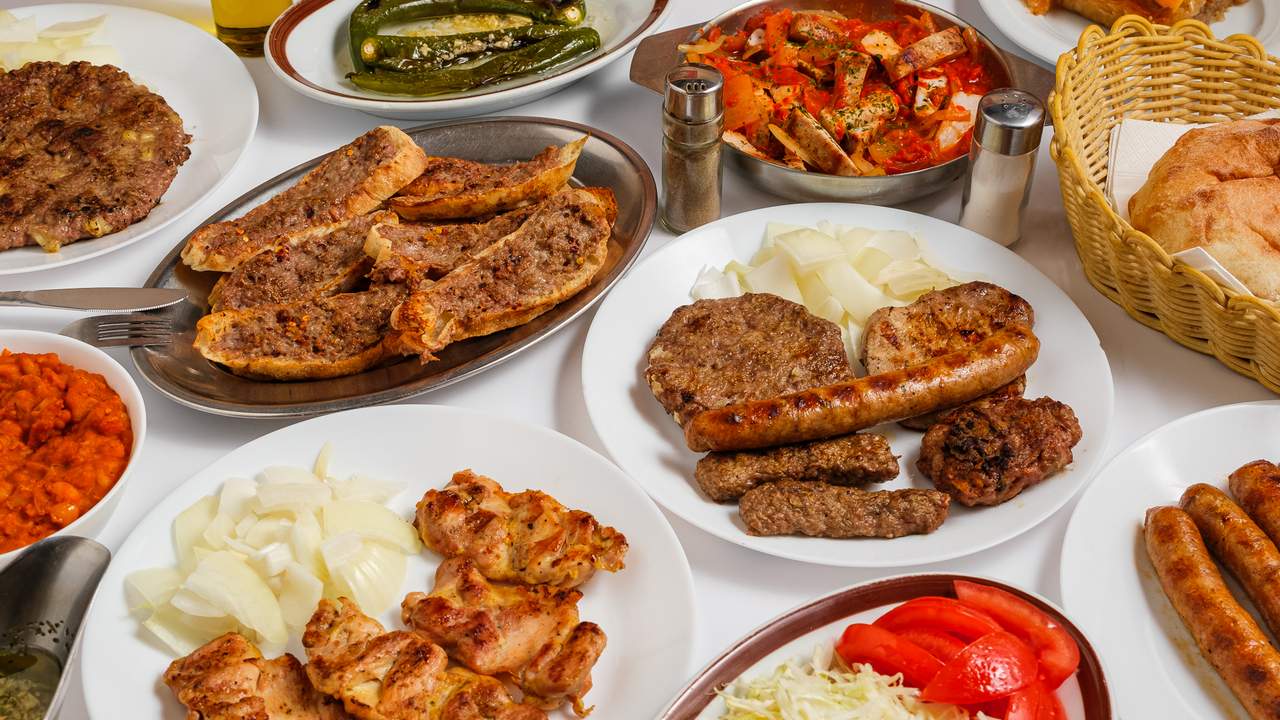 Pileći file, svinjski vrat, roštilj kobasica, iskošteni batak/zabatak, ćevapi, prilog po navedenom izboru, luk, kruh