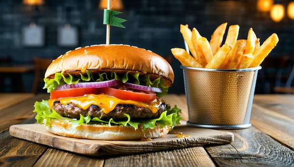 Homemade brioche, 100% junetina, dimljeni cheddar, zelena salata, rajčica, kiseli krastavci, special umak, krumpirići
