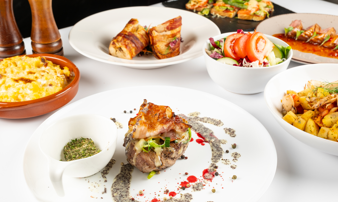 Za dvije osobe pureći medaljoni panirani u sjemenkama. svinjska pisanica s mirisnim biljem, teleći kotlet s gljivama. domaći kroketi, povrže na žaru, hajdinska kaša.Svi prilozi se dodatno nadoplaćuju!