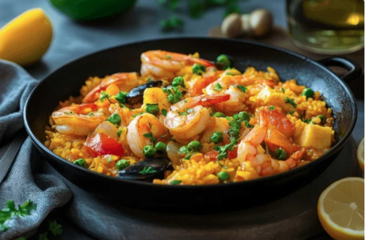 Arroz bomba, calamari, cozze, scampi, gamberi, polpo, piselli, peperone rosso