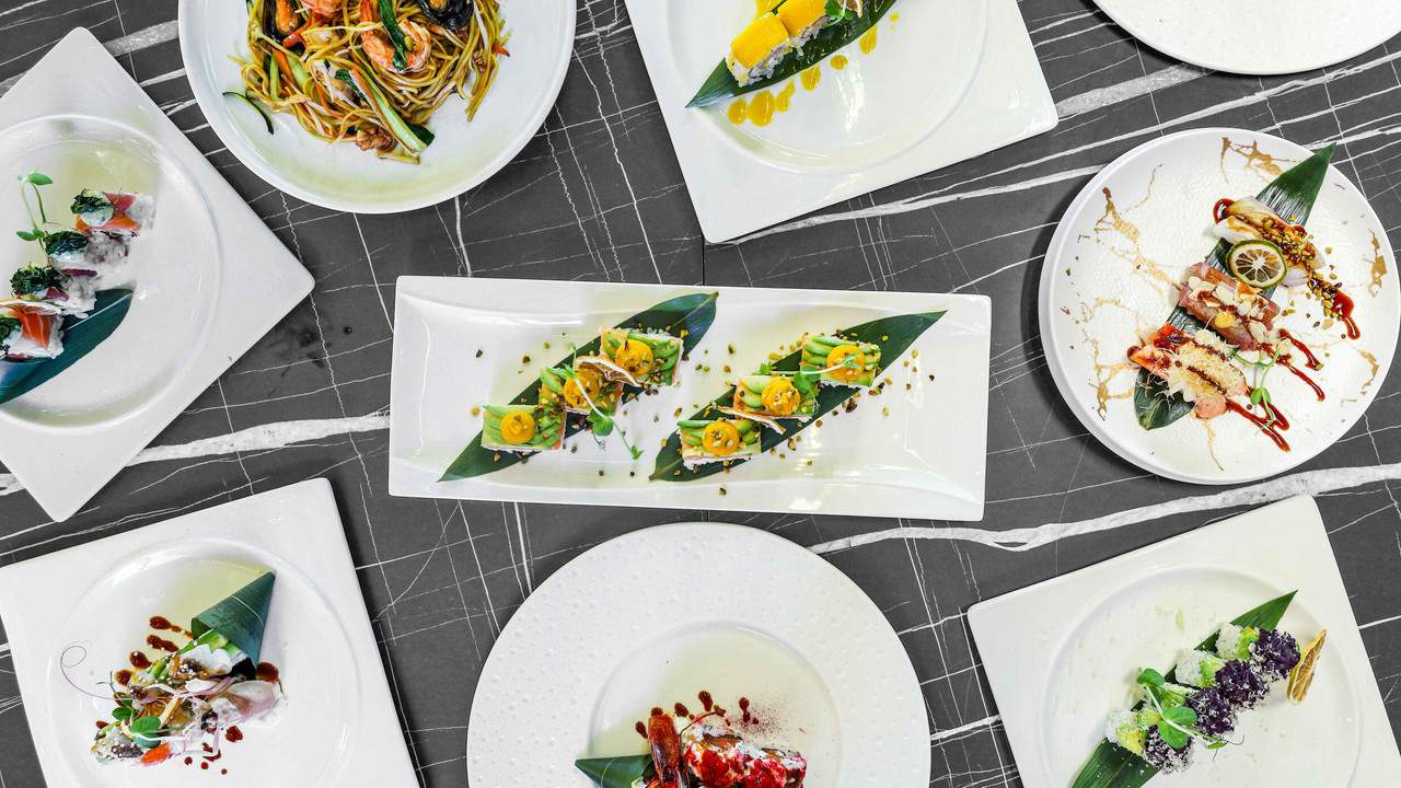 Insalata mista, pomodolini, pesce crudo misti, salsa sesamo