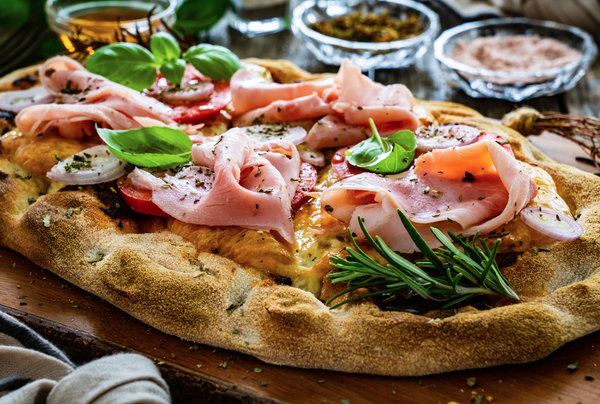 Focaccia con base bianca, condita con ingredienti crudi, pomodorini con glassa di aceto balsamico di Modena