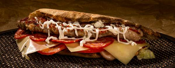 Lattuga, salsiccia, salame piccante, pomodoro, bacon, emmental