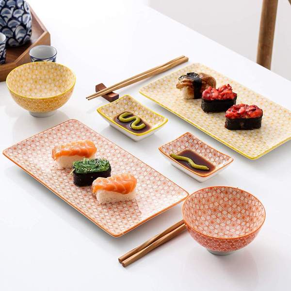 Arrotolato di gamberi, tartare di tonno, granella di tempura, salsa teriyaki e tabasco