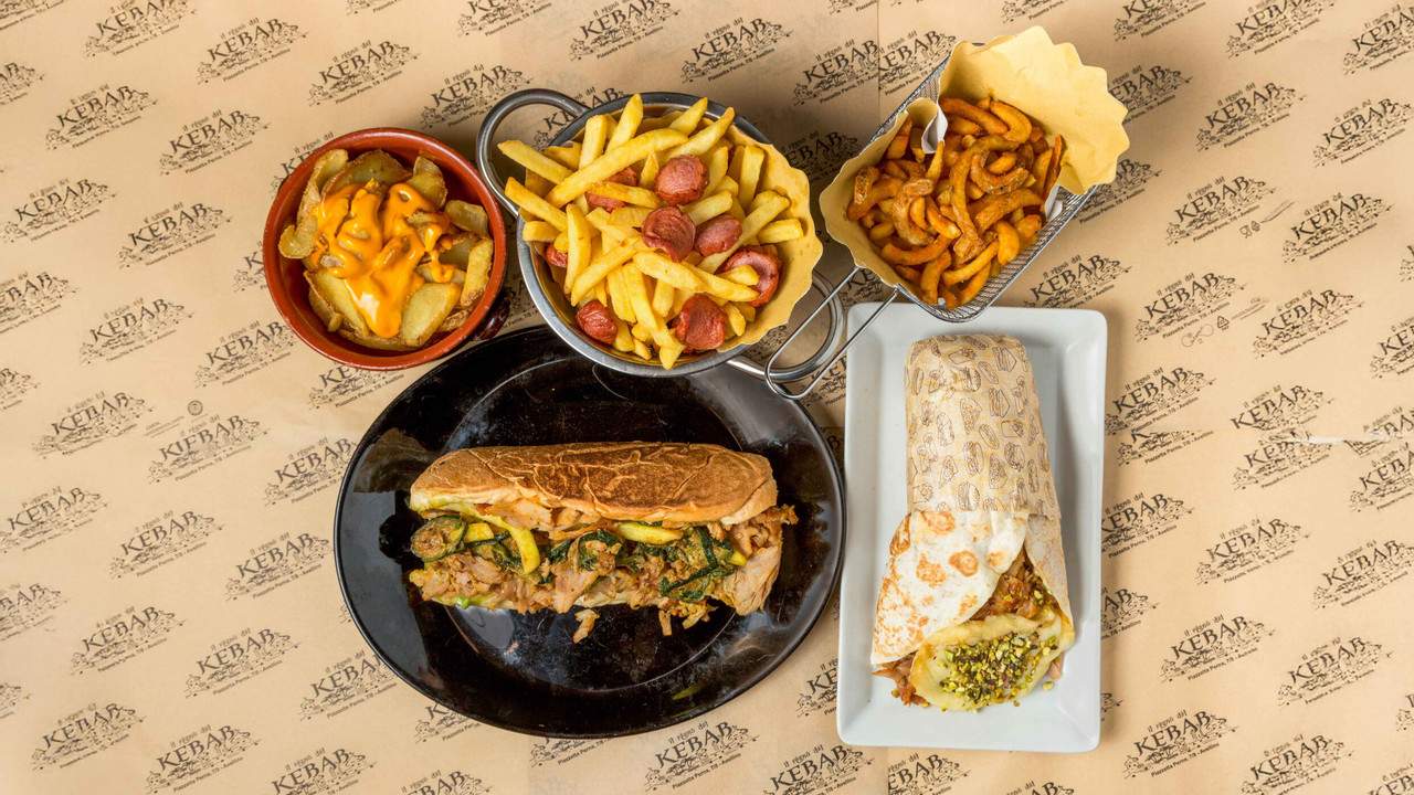 Carne, patatine, insalata, pomodori, cipolla,cetrioli, zucchine, piccante, baba Gannouge