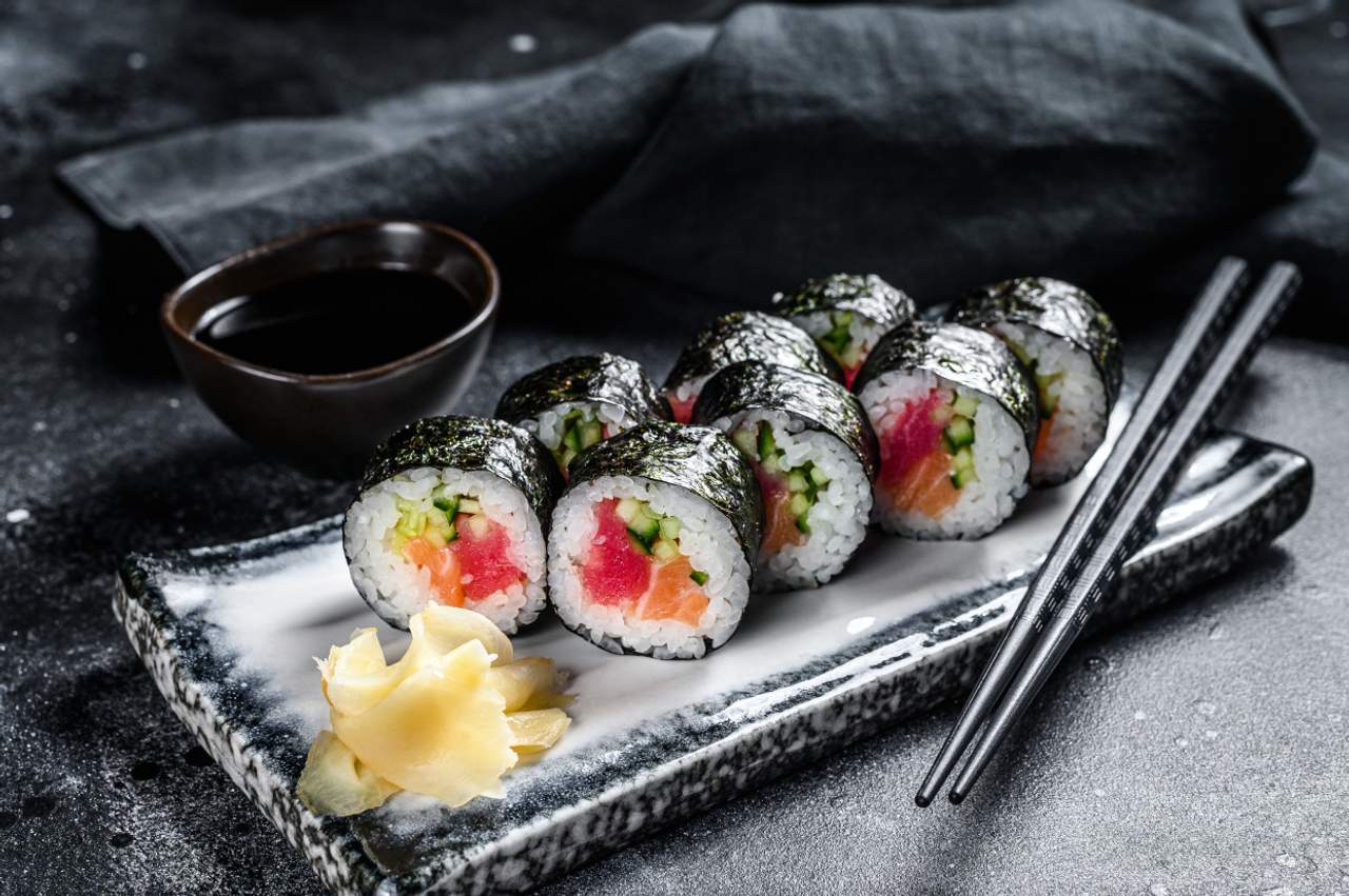Riso venere, salmone cotto, Philadelphia, maio piccante e cheddar 8 pezzi