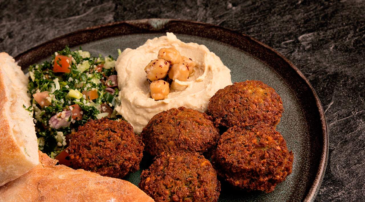 6 Polpette di falafel a base di prezzemolo e ceci, serviti con hummus, tahina e insalata