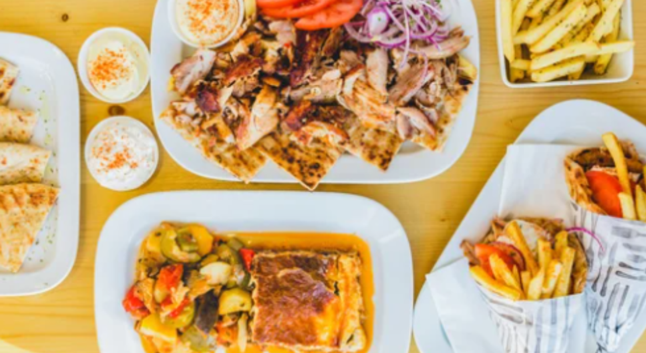 GYROS DI POLLO E GYROS DI MAIALE, PITA ARTIGIANALE, POMODORO PATATINE FRITTE E SALSA A SCELTA