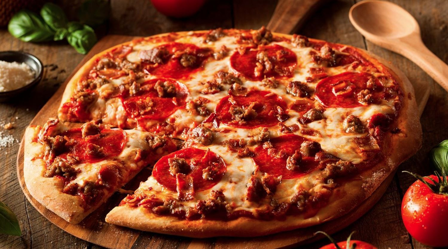 Pomodoro, mozzarella, prosciutto cotto, salsiccia, patatine e gorgonzola
