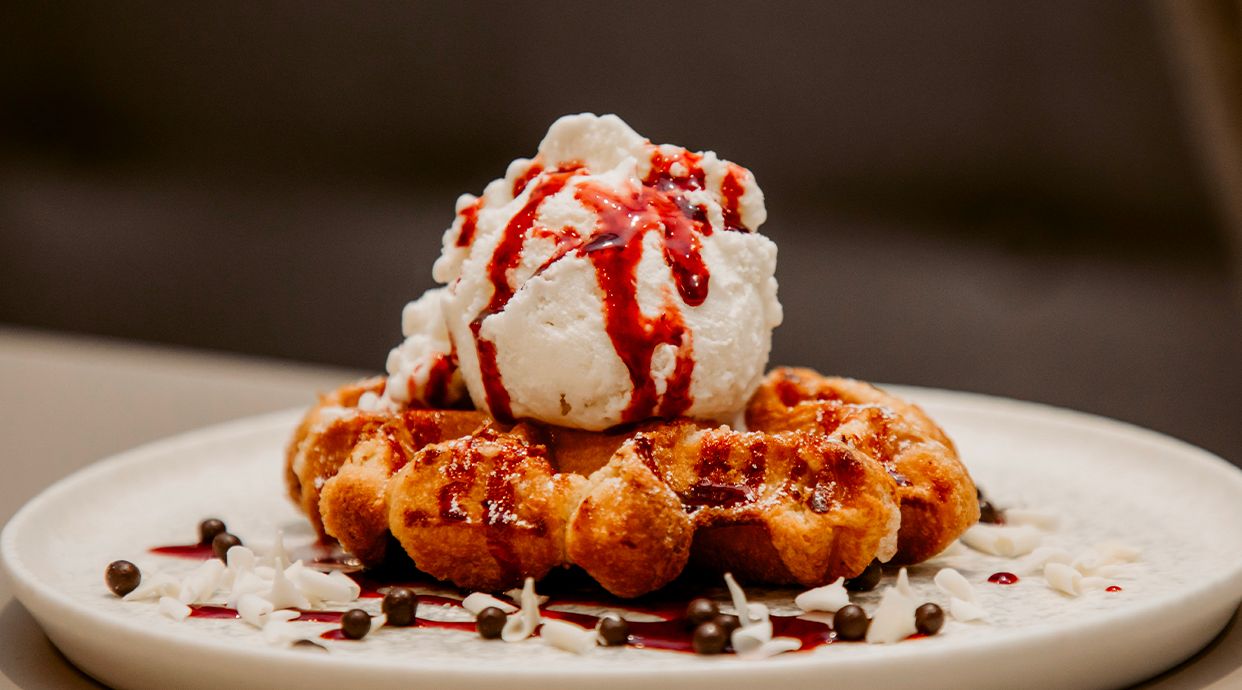 Crepes ripiena con gelato, yogurt e salse a tuo piacimento
