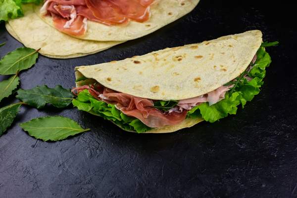 Piadina artigianale farcita con prosciutto crudo, squacquerone e rucola