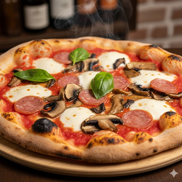 Pomodoro, mozzarella, prosciutto cotto, olive, funghi, carciofi