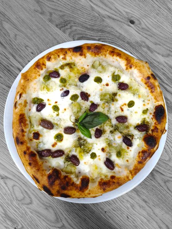 Mozzarella fior di latte, provola Campana D.O.P, patata schiacciata, salsiccia, pepe nero, basilico, olio EVO