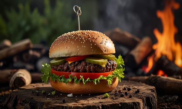 Hamburger 180 g, bacon, cheddar, insalata e salsa burger piu patatine fritte