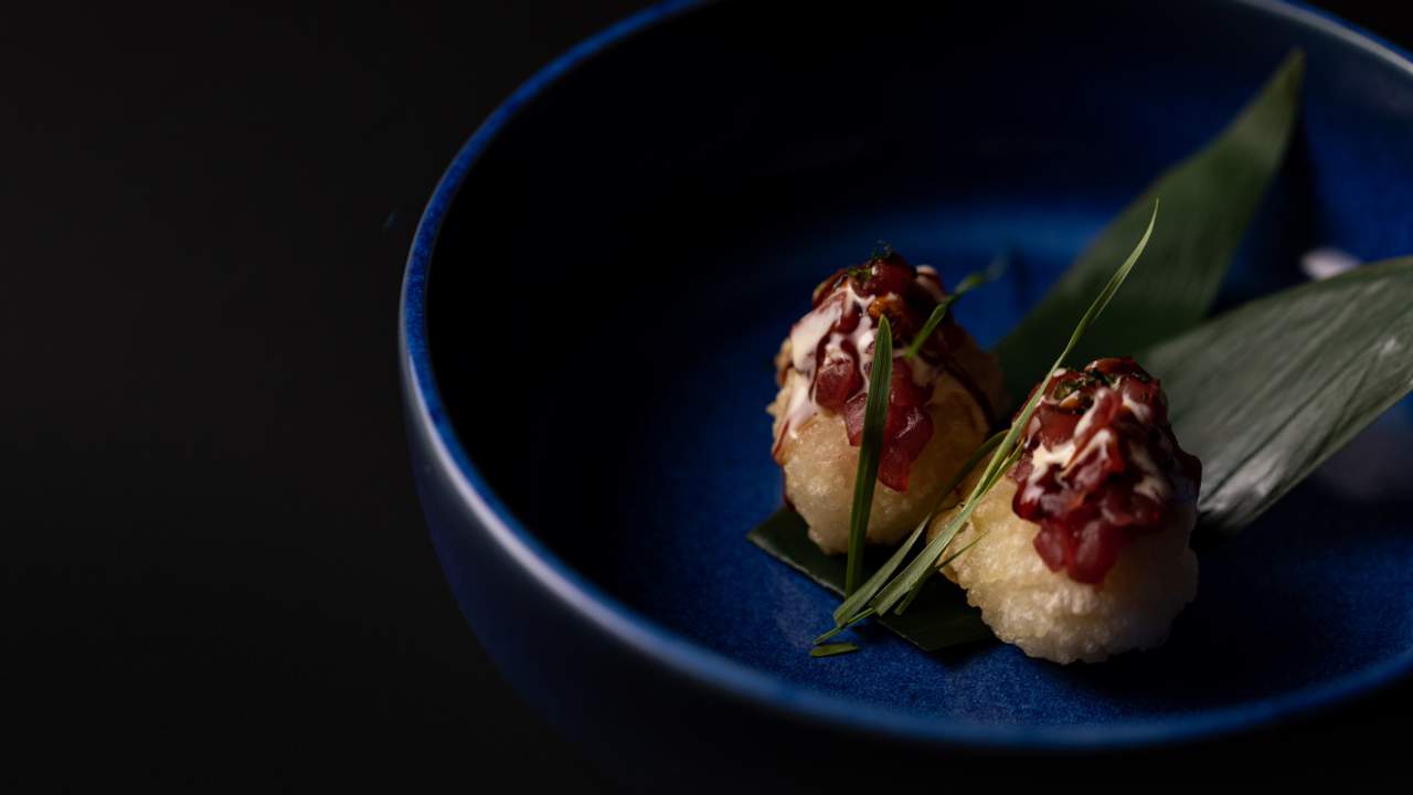 Pallina di riso avvolta da tonno con tartare di scampo e salse speciali 2 pezzi