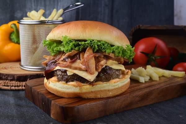 Carne, 2 fette di cheddar, cetriolini, jalapeño piccante, tacchino arrosto, maionese al miele