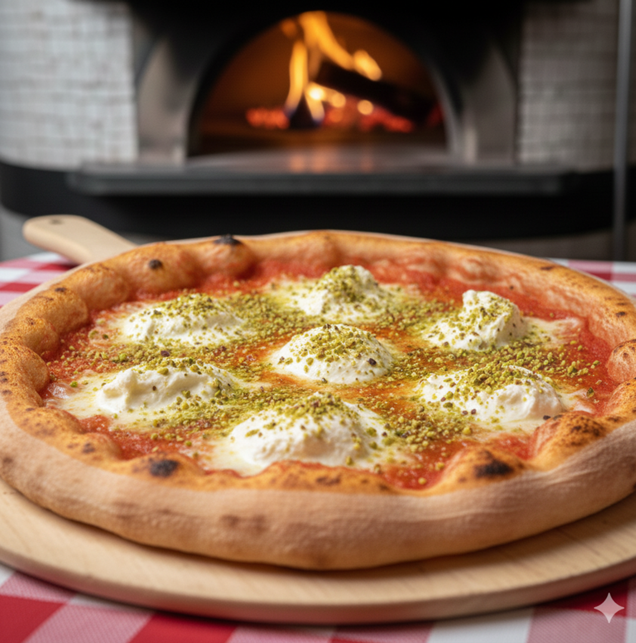 Fior di latte, mortadella, pistacchio, stracciatella, aceto balsamico, olio EVO