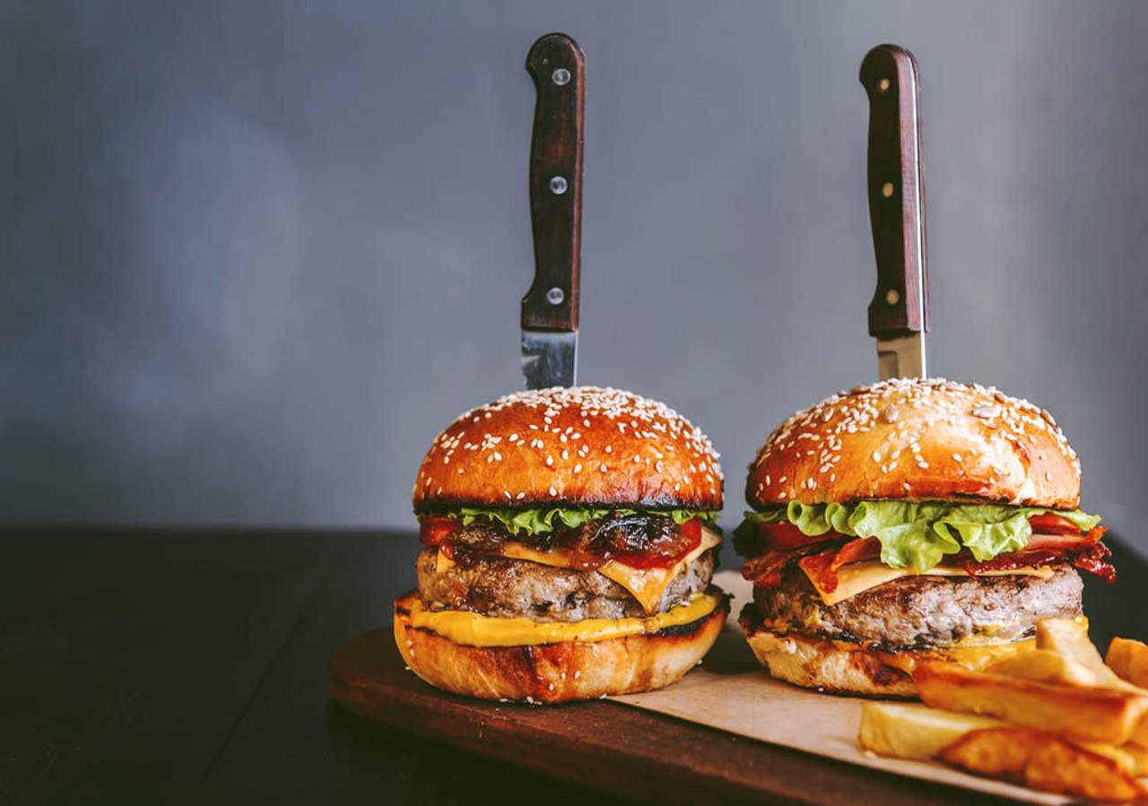 Bun, 2 burger di black angus da 200 g, bacon, insalata, pomodoro, cheddar, salsa barbecue e patatine
