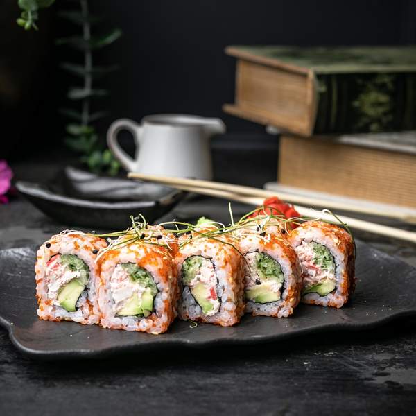 Fritto gamberi, avocado, gambero cotto, salsa spicy, maionese e teriyaki