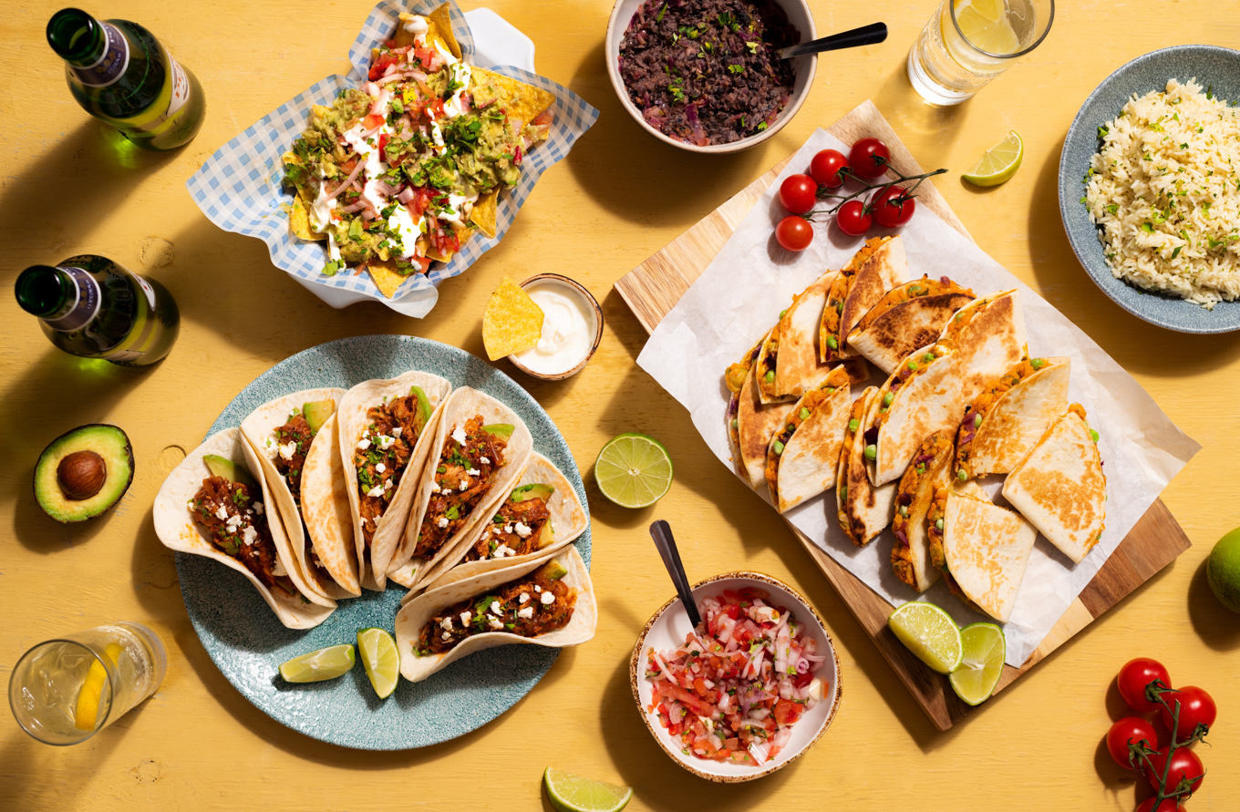 Tacos di mais con carne di manzo sfilacciata e speziata, guacamole e parmigiano