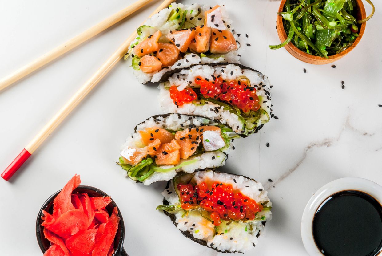 Riso avvolto da salmone tartare di salmone maionese piccante