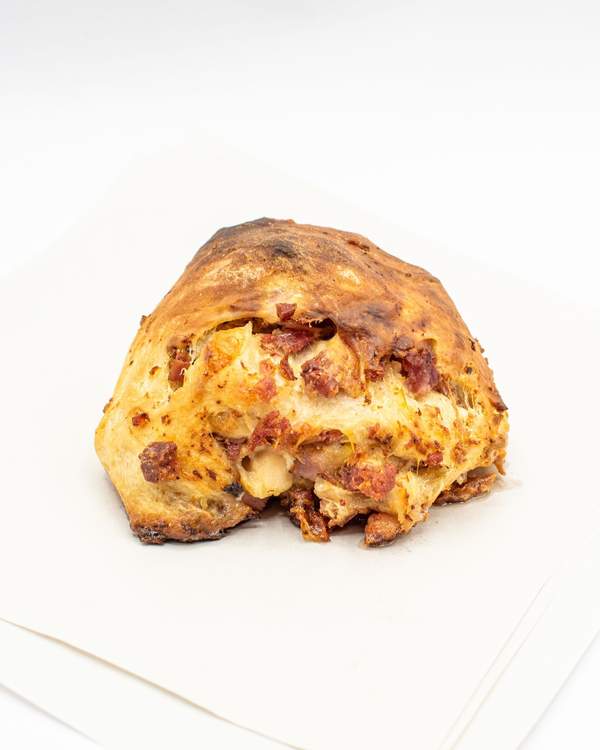 Sua Maestà O Pagnottiello è un capolavoro della tradizione napoletana in monoporzione: salame, pancetta, uova sode e formaggio filante si uniscono in un impasto ricco e saporito, regalando un’esperienza gastronomica regale e irresistibile!