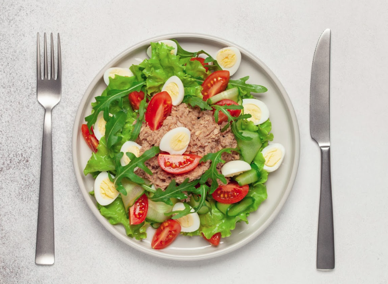 Insalata mista, fagioli cannellini, tonno sott'olio, pomodorini mais, tarallo