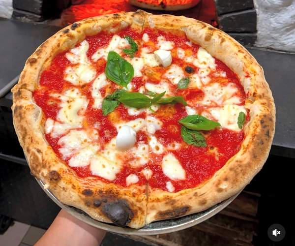 Pomodoro San Marzano DOP, prosciutto cotto, salame Negroni, funghi champignon, carciofi, olive nere, basilico ed olio evo.