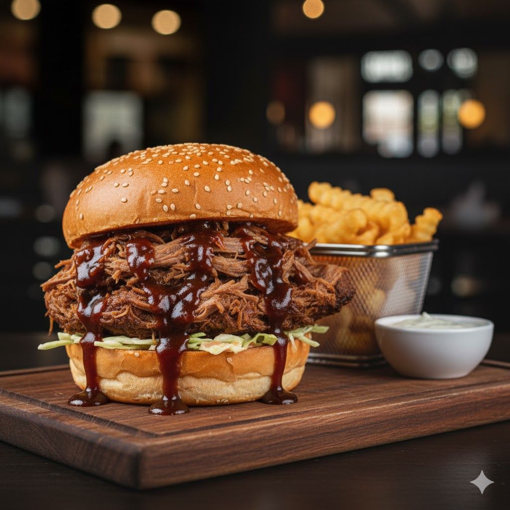 Petto di pollo croccante, speziate, salsa BBQ, salsa buffalo piccante, salsa cheddar, cetrioli, insalata, pomodoro, cipolla croccanti (con patatine)