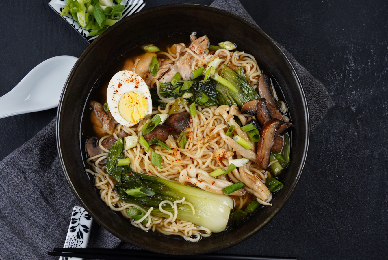Tagliolini di riso thailandesi con pollo, gamberi, verdura e uova, in salsa artigianale Speziato.