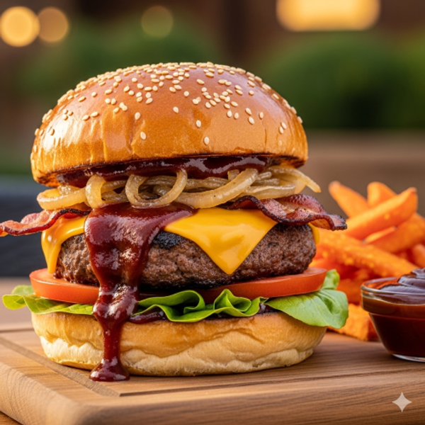 Panino con triplo burger di manzo, triplo formaggio, pomodoro e insalata