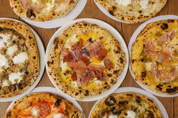 Salsa al datterino giallo, bufala, crudo, pom secchi, pesto al basilico