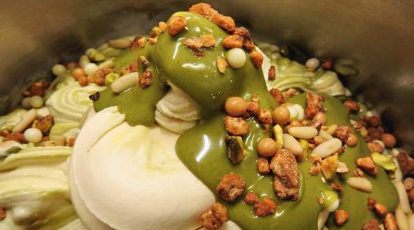 bavarese alla panna cotta con arachidi salati , pinoli e caramello NB. scongelare il dolce 30 min prima di mangiare