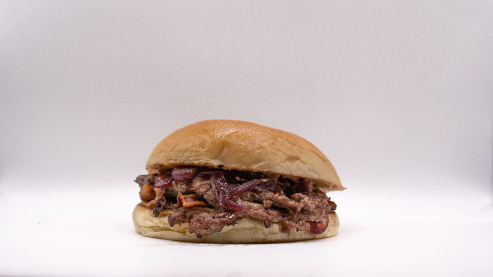 Pane artigianale, burger di fassona smashato, scamorza fusa, bacon croccante, cipolla caramellata