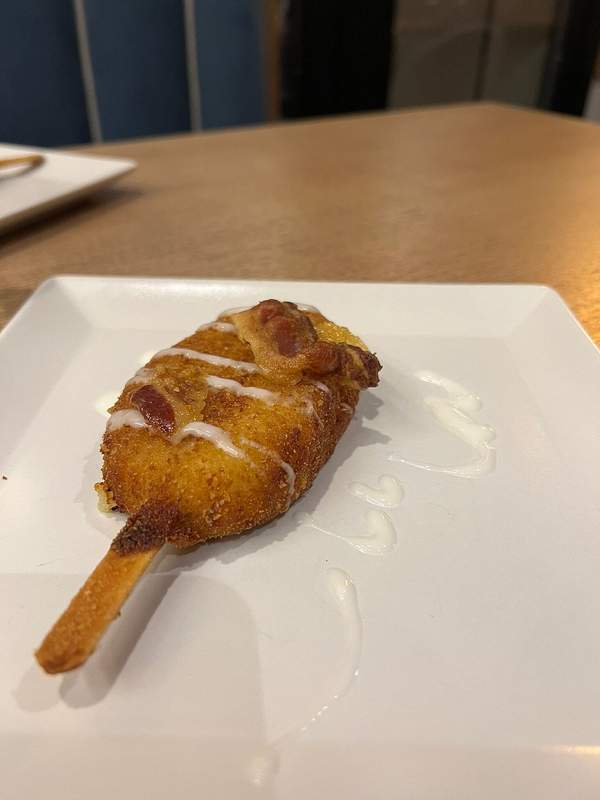 Bocconcino di bufala campano avvolto con mortadella ed impanato nella pastella, con fonduta di formaggio e pistacchi