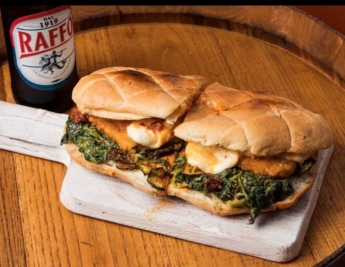Cotoletta di Pollo panata,crispy bacon,funghi, melanzane a funghetto al pomodoro, Provola affumicata, salsa Boscaiola avvolti in un morbido Bun.