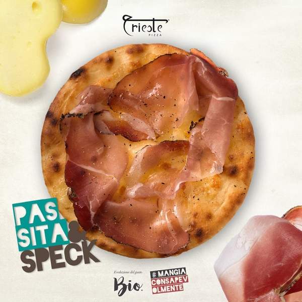 Impasto bio (contiene glutine), passita affumicata, speck i.g.p., pepe nero, olio evo bio