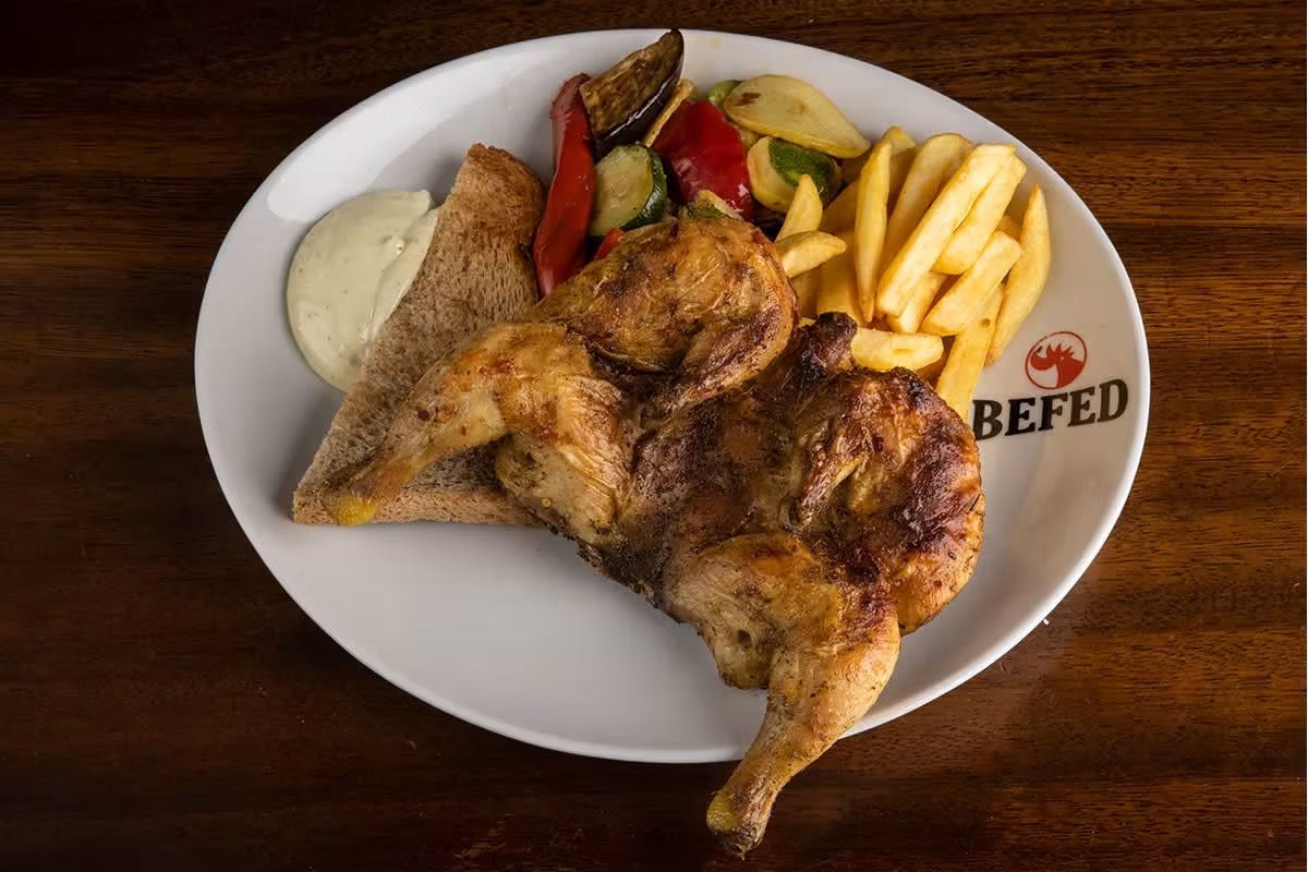 Mezzo Galletto speziato e leggermente piccante con contorno di patate fritte* e pane integrale* tostato con burro, accompagnato da salsa BEFED