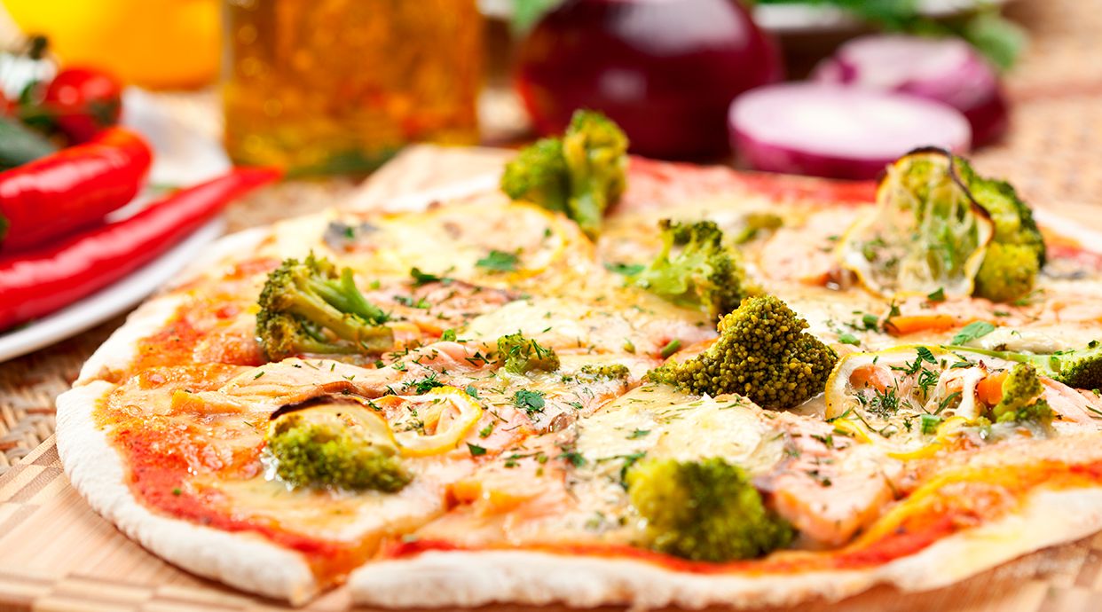 Pomodoro, mozzarella fior di latte, prosciutto cotto, basilico, carciofi, olive nere, funghi e olio extravergine d'oliva
