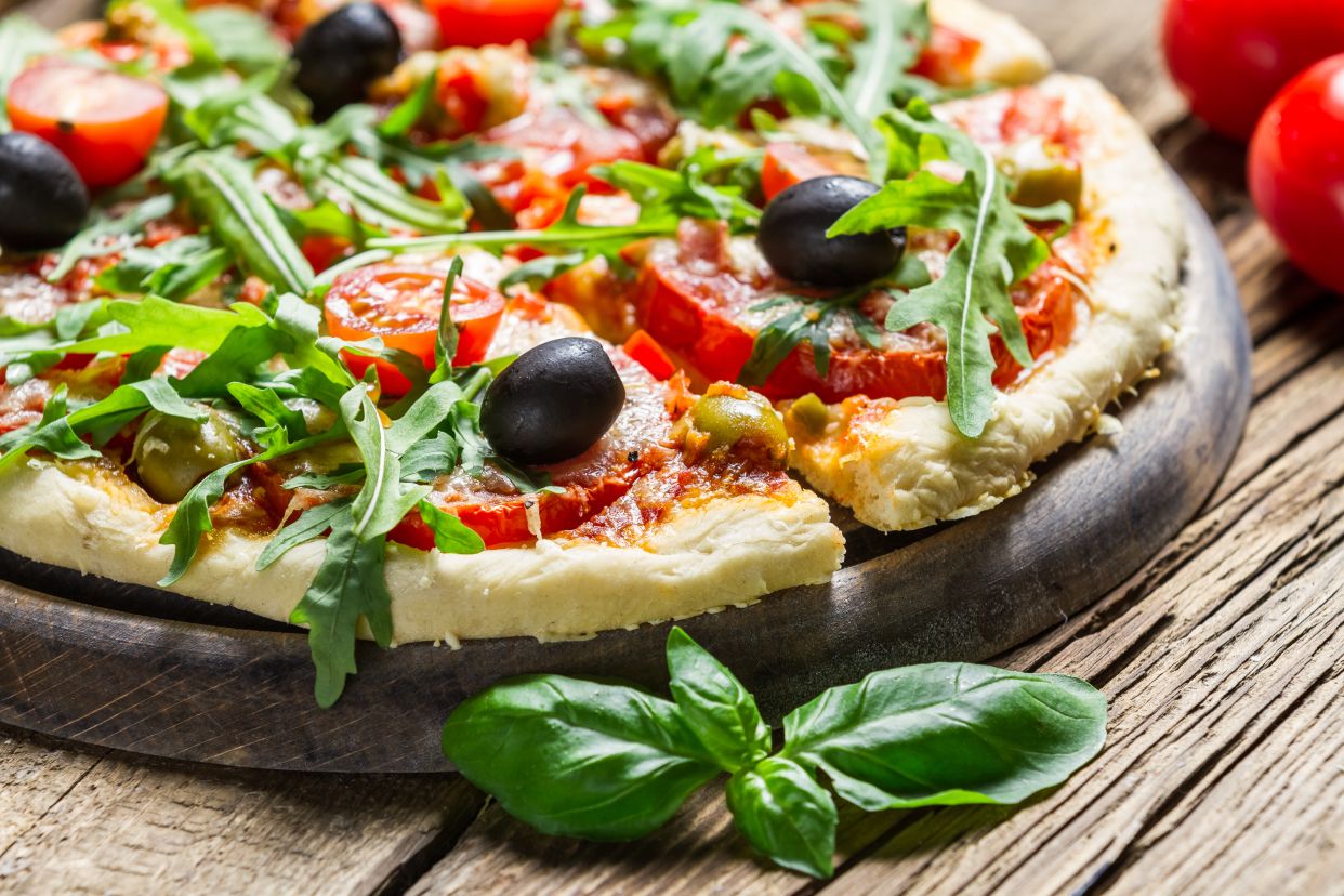 Pomodoro, mozzarella, fungi chanpignon, prosciutto cotto, carciofi, olive nere