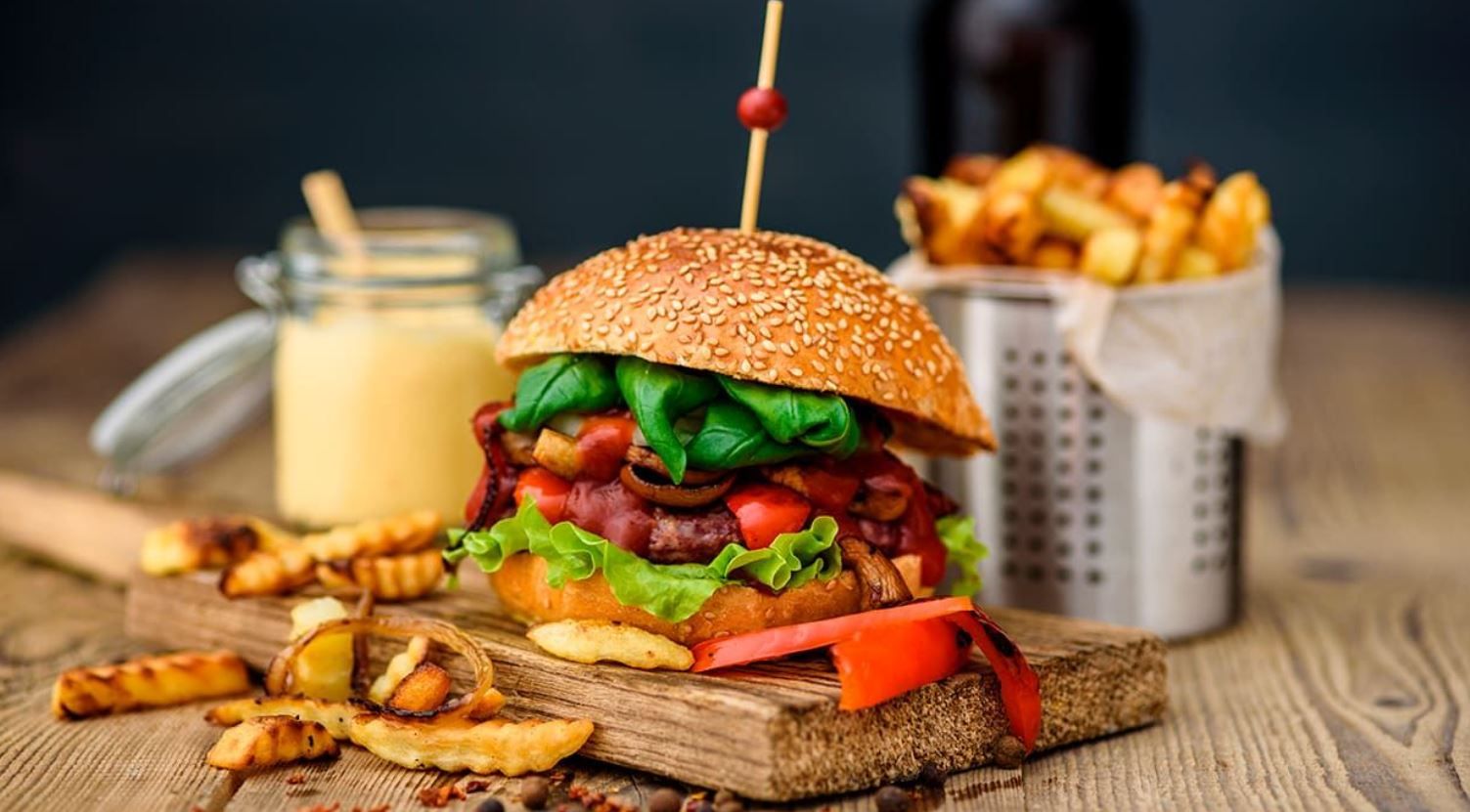 Pane di nostra produzione, Hamburger 100g, Cheddar cheese, Patate Fritte, Bacon Croccante, Insalata Verde e Salsa Cheddar